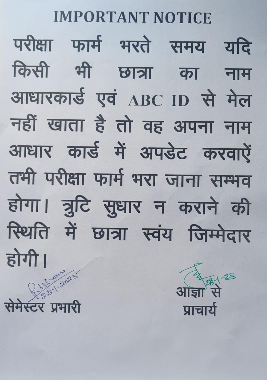 परीक्षा फार्म भरते समय यदि किसी भी छात्रा का नाम आधारकार्ड एवं ABC ID से मेल नहीं खाता है तो वह अपना नाम आधार कार्ड में अपडेट करवाऐं तभी परीक्षा फार्म भरा जाना सम्भव होगा। त्रुटि सुधार न कराने की स्थिति में छात्रा स्वंय जिम्मेदार होगी।