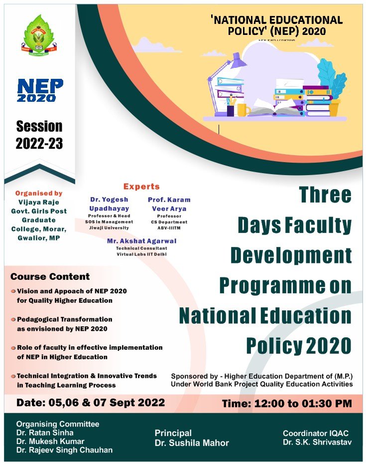 महाविद्यालय में FDP का तीन दिवसीय कार्यक्रम दिनांक 05, 06, 07.09.2022 में आयोजित किया जा रहा है। इसका मुख्य विषय नवीन शिक्षा नीति-2020 है।