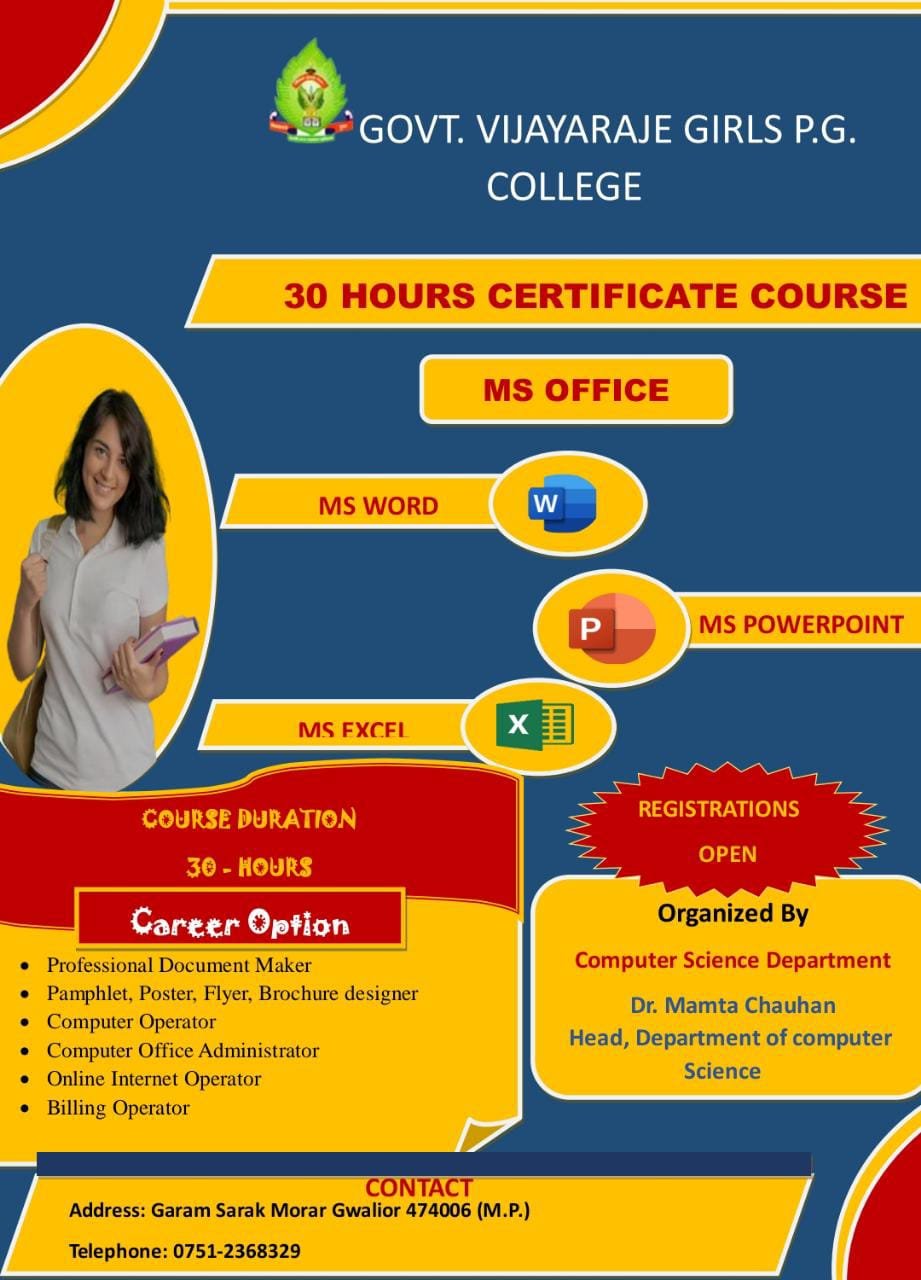 Registrations open for certificate course in M.S office. For more details contact in computer department