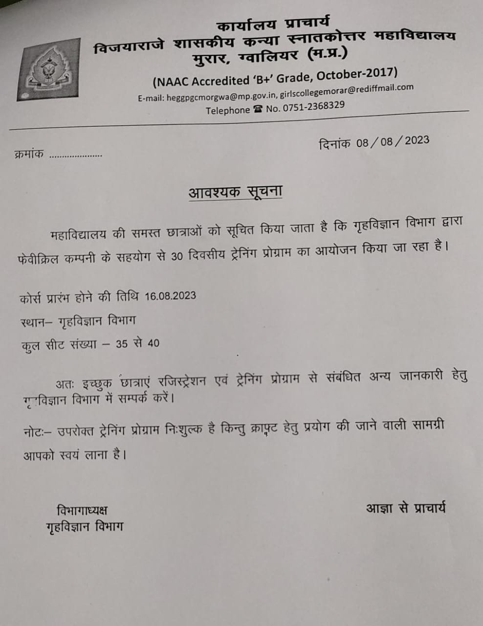 30 दिवसीय ट्रेनिंग प्रोग्राम का आयोजन गृहविज्ञान विभाग में निःशुल्क किया जा रहा है।